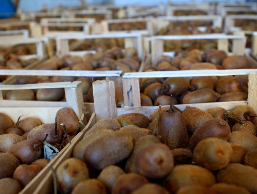 Киви собирают в несколько приемов с интервалом 7-10 дней. Для стран-экспортеров вполне приемлемо собирать незрелые плоды, так как они могут созревать сами по себе вне куста. В процессе уборки урожая используется ручной труд. Собранные плоды складывают в ящики правильными рядами, сортируя по диаметру и стараясь не прижимать плоды пальцами. На киви не остается плодоножки, это не влияет на сохранность плода, в отличие от яблок, груш, вишни. Хранить плоды можно 2-3 месяца при условии, что температура воздуха в помещении не выше + 2 ° С и не ниже 0 °. Некоторые сорта обладают настолько хорошей лежкостью, что выдерживают 4-5 месяцев хранения. В идеале спелый плод имеет очень нежный вкус, напоминающий вкус манго, абрикоса, крыжовника. А незрелые очень кислые и могут вызвать сильное раздражение слизистой оболочки рта.