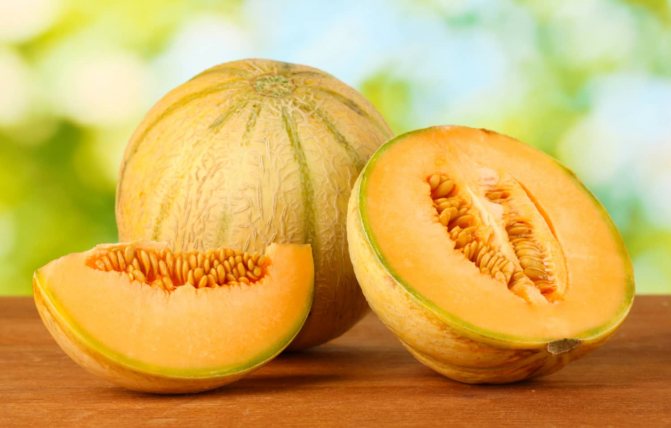 | Фрукты | Маленький размер. Вес тыквы колеблется в пределах 1-1,5 кг, диаметр — 23-25 см. Цвет кожуры зеленоватый или желтый. Встречаются экземпляры с желтыми и зелеными полосами. Корочка покрывается коричневой или белой сеткой-решеткой. По форме округло-приплюснутые, плоды овальной формы встречаются редко. Мякоть нежная и сочная, ярко-желтая, светло-зеленая или белая. Вкус сладкий с мускусным ароматом. Семена обильные и пригодны для выращивания. |