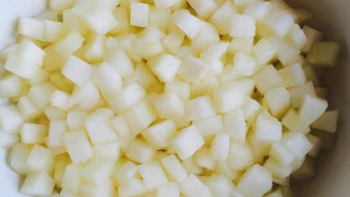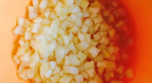 - Яблоки вымыть и очистить от кожуры, нарезать кубиками, переложить в отдельную посуду, сбрызнуть лимонным соком.