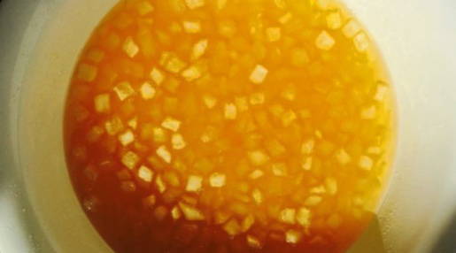 - Очищенную дыню нарезать кубиками, апельсин очистить от кожуры, снять верхний слой цедры, из мякоти отжать сок.