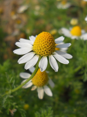 «Ромашка аптечная относится к травянистым растениям Compositae. Стебель прямой, прямостоячий, ребристый. Листья от 20 до 40 см. В корзинках цветки трубчатые белые, центр — желтый. Цветет в конце мая — начале августа запах резкий, приятный, особенно молотый » используется в лечебных целях.