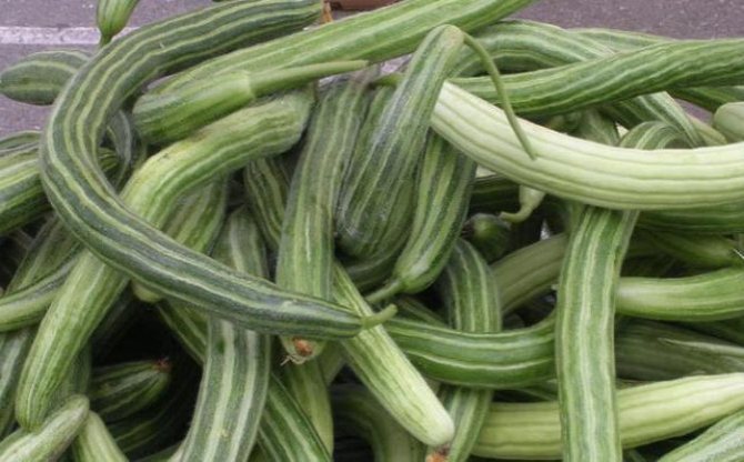 - Плоды: необычной формы, очень длинные (до 50 см), цвет от зеленого до белого, у некоторых экземпляров есть прожилки. На вкус как дыня.